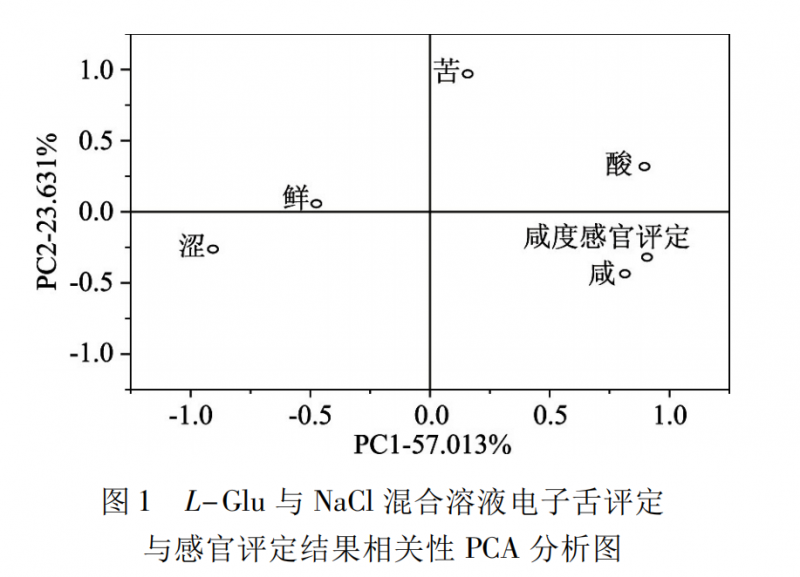 電子舌除了對(duì)溶液的咸度進(jìn)行評(píng)定以外,還對(duì)溶液的酸、苦、澀、鮮四種味道進(jìn)行評(píng)定。將電子舌所測(cè)得的咸、酸、苦、澀、鮮五組數(shù)據(jù)和感官咸度評(píng)分共六個(gè)因素進(jìn)行主成分分析( PCA) 得到主成分載荷圖( 圖 1) 。由圖 1 可以看出,PC1 和 PC2 累積方差貢獻(xiàn)率為 80.644% ,反映了樣品的大部分信息。在圖上距離越近,因素間的相關(guān)性越強(qiáng)。如圖 1 所示,“感官咸度評(píng)分”與電子舌輸出數(shù)據(jù)“咸”距離最近,而與電子舌其他數(shù)據(jù)“酸”、“苦”、“澀”、“鮮”距離很遠(yuǎn),說(shuō)明電子舌對(duì)溶液咸度的評(píng)分“咸”與感官咸度評(píng)分相關(guān)性較高。