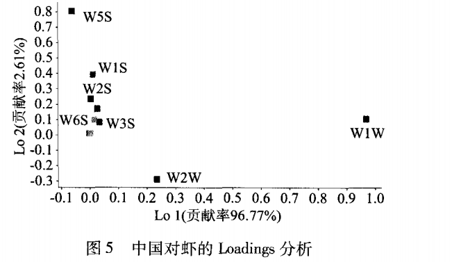 Loadings分析是對不同傳感器的貢獻率進行分析,可以用來判別電子鼻的各個傳感器的相對重要性。如果某一傳感器的響應(yīng)值接近原點(0,0),則該傳感器的識別作用可以忽略不計;而當(dāng)傳感器的響應(yīng)值越偏離原點,則說明該傳感器的識別能力越強。圖 5為空白樣品的 Loadings 分析圖,由圖 5可知,總貢獻率為 99.38% ,其中傳感器 W 1W (無機硫化物)和 W2W (有機硫化物)對第一主成分貢獻率較大,W 5S(氮氧化合物)和的 W 1S(烴類物質(zhì))傳感器對第 2 主成分貢獻率較大,W3S(烷烴)和 W6S(氫氣)傳感器則基本接近原點,其貢獻率最小。中國對蝦在貯藏期間由于在微生物的作用,肌肉中的蛋白質(zhì)、氨基酸及其它含氮物質(zhì)進一步分解成氨氣、三甲胺、硫化氫、及組胺等,使蝦散發(fā)出具有腐敗特征的臭味,這與電子鼻檢測的結(jié)果相符,說明通過電子鼻技術(shù)可以有效的反映中國對蝦在貯藏過程中揮發(fā)性物質(zhì)的變化。