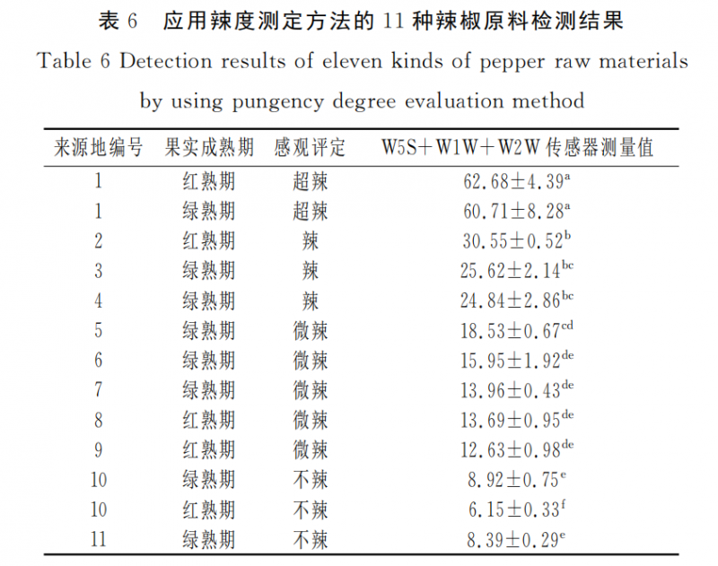 由表6可知,11種辣椒原料存在顯著性差異,說明利用電子鼻可以有效區(qū)分辣椒品種。且所有紅熟期辣椒、所有綠熟期辣椒和同一品種紅綠果辣椒辣度測(cè)定結(jié)果均與上述結(jié)果吻合:感官評(píng)價(jià)為不辣的辣椒原料,其 W5S、W1W、W2W 數(shù)值之和在1~10之 間;感官評(píng)價(jià)為微辣的辣椒原料,其 W5S、W1W、W2W 傳感器辣度值之和在10.1~20之間;感官評(píng)價(jià)為辣的辣椒原料,其 W5S、W1W、W2W 傳感器辣度值之和在20.1~50,其中,魔鬼椒的 W5S、W1W、W2W 傳感器辣度值之和大于50.1,評(píng)定為超辣,證明電子鼻測(cè)定辣椒辣度的可行性。