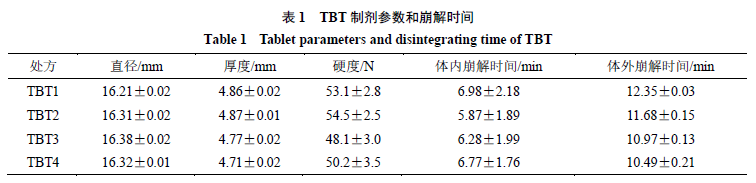 含片硬度、崩解時(shí)間的測(cè)定 采用游標(biāo)卡尺測(cè)定TBT的厚度和直徑,片劑測(cè)試儀測(cè)量片劑的硬度。崩解時(shí)間的測(cè)定選取12名健康志愿者(20~30歲,來(lái)自成都中醫(yī)藥大學(xué))評(píng)價(jià)。將片劑含于口腔內(nèi),直到片劑崩解完全,記錄時(shí)間,得到其體內(nèi)崩解時(shí)間;將900 mL水加熱維持在(37.0±0.5)℃,作為崩解介質(zhì),采用崩解儀測(cè)定含片的體外崩解時(shí)間。TBT的基本制劑質(zhì)量參數(shù)見(jiàn)表1。掩味后2種含片的外觀直徑略大于原片,厚度變小,可能是由于硬度變小所導(dǎo)致。4種含片的體內(nèi)崩解時(shí)間與體外崩解時(shí)間差異較大,可能是由于人體測(cè)試過(guò)程中會(huì)不自主的摩擦攪拌含片,故崩解時(shí)間縮短。4種TBT的體外崩解時(shí)間均能滿足口含片不在10 min內(nèi)全部崩解或溶化的要求。