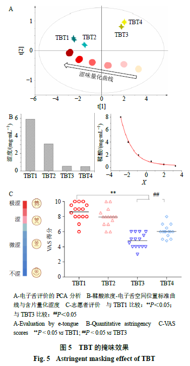 (2)感官分析驗(yàn)證:采用視覺(jué)模擬量表法(visual analogue scale,VAS)進(jìn)行評(píng)估。感官評(píng)價(jià)小組由來(lái)自成都中醫(yī)藥大學(xué)的健康志愿者(20~26歲,味覺(jué)正常,無(wú)抽煙、酗酒史)構(gòu)成,實(shí)驗(yàn)經(jīng)過(guò)成都中醫(yī)藥大學(xué)附屬醫(yī)院倫理委員會(huì)(批準(zhǔn)編號(hào):2014KL016)審核批準(zhǔn)。首先,采用酸(檸檬酸)、苦(奎寧)、甜(蔗糖)、咸(氯化鈉)、鮮(谷氨酸鈉)、澀(鞣酸)6種味覺(jué)溶液測(cè)試志愿者的味覺(jué)靈敏度;再用鞣酸溶液(0.062 5、0.125、0.25、0.5、1、2、4、8 mg/mL)訓(xùn)練志愿者對(duì)澀味強(qiáng)度的認(rèn)知,熟悉評(píng)價(jià)標(biāo)準(zhǔn)。最終,15名志愿者(5名男性和10名女性)參加TBT的澀味評(píng)估。志愿者將口含片置于口腔內(nèi),含服至無(wú)顆粒感,根據(jù)量表的標(biāo)尺評(píng)分。樣品測(cè)試間隔,用純水沖洗口腔至無(wú)澀味感,并給予一定時(shí)間休息。