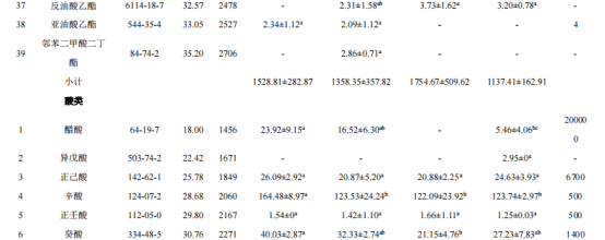 4個產(chǎn)地石榴酒中共檢測出8中酸類物質(zhì),共有物質(zhì)5種。四個產(chǎn)地的石榴酒中含量最高的均為辛酸,其濃度較低時,呈令人愉悅的脂肪香和果香。