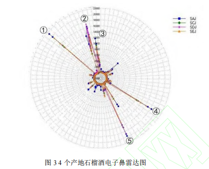 4個產(chǎn)地石榴酒電子鼻雷達圖對比分析