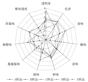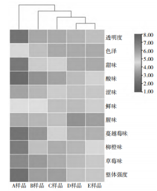 對不同果味膠原蛋白肽固體飲料的感官屬性強度進行熱圖聚類分析的結(jié)果見圖3。5種樣品大致可分為3類,即C、D和E最先聚為一類,其透明度、色澤和甜味等方面的感官性質(zhì)較為相似,說明蔓越莓味和草莓味在感官上整體相似;第二類為B樣品,其柳橙味和色澤較為突出;第三類為A樣品,其在透明度表現(xiàn)最突出,這與主成分分析呈現(xiàn)了相同結(jié)果。同時發(fā)現(xiàn)A樣品為純膠原蛋白肽粉呈現(xiàn)出的腥味較濃,而B、C、D、E這4款膠原蛋白肽固體飲料樣品腥味較淡,這4款產(chǎn)品配方中添加了果粉,說明果粉有效掩蓋了膠原蛋白肽的腥味。
