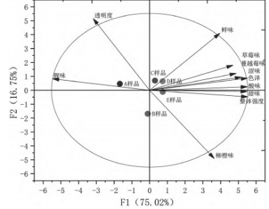 這5款膠原蛋白肽固體飲料在風味特征上主要歸納為以下4類屬性,即口感、果味、外觀及整體強度,其中口感具體表現(xiàn)為酸、甜、澀、鮮和腥,氣味具體表現(xiàn)為草莓味、柳橙味、蔓越莓味等。由表2、圖1可知,這5款樣品在上述屬性上各有特點。①口感:E和D樣品的酸甜味最強,腥味最弱;C樣品酸甜味適中,澀味最強;A樣品腥味最強,甜酸澀味最弱;B樣品的腥味適中,其他味較弱。②果味:B樣品表現(xiàn)出明顯的柳橙味,蔓越莓味和草莓味稍帶適中;C樣品則表現(xiàn)出明顯的蔓越莓味,柳橙味和草莓味稍帶適中;D和E樣品表現(xiàn)出明顯的草莓味,柳橙味和蔓越莓味稍帶適中;A樣品相比較于其他膠原蛋白固體飲料,帶有的果味最弱。③外觀:A樣品的透明度最強,色澤最弱;B樣品的透明度最弱,色澤較弱;C、D和E的色澤相近,透明度適中。④整體強度:D和E樣品的整體口感和風味度最強,其次是B和C樣品,最弱是A樣品。說明添加了果粉的膠原蛋白肽固體飲料在色澤、滋味和氣味方面更豐富。3 不同膠原蛋白肽固體飲料的感官屬性的PCA分析