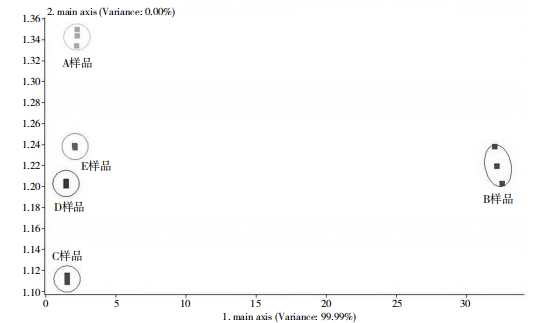 利用電子鼻對5種不同果味膠原蛋白肽固體飲料的揮發(fā)性成分進行測定后,將采集得到的數(shù)據(jù)進行主成分分析,分析結(jié)果如圖4所示。第1和第2主成分的累積貢獻率達到99.99%,說明電子鼻對其揮發(fā)性成分表現(xiàn)出較高的識別度和靈敏度??傮w看,各樣品的揮發(fā)性成分有各自的分布位置,基本沒有重合,說明電子鼻對于5種樣品氣味的區(qū)分度總體較好,所有樣品的風味相對獨立,原因可能是因為不同果味膠原蛋白肽固體飲料的配方組成存在一定差異,所以在不同果味膠原蛋白肽固體飲料形成的揮發(fā)性成分亦有所不同。C、D和E樣品在第1主成分上的相距較近,但在第2主成分上能完全區(qū)分開,說明草莓味和蔓越莓味的膠原蛋白肽固體飲料的氣味上略有相似,而B樣品在第1主成分上與其他樣品相聚甚遠,說明柳橙味的膠原蛋白肽固體飲料氣味與其他樣品差異最為明顯。根據(jù)感官結(jié)果發(fā)現(xiàn)A樣品在氣味上主要呈現(xiàn)腥味,B樣品為柳橙味的膠原蛋白肽固體飲料與A樣品在氣味上相差甚遠,從電子鼻分析結(jié)果得出,柳橙味的果粉相比較蔓越莓和草莓味的果粉的掩腥效果更好。