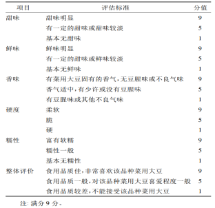 感官評(píng)定小組由江蘇省農(nóng)業(yè)科學(xué)院豆類研究室的8名老師及研究生組成。采用9分嗜好法對(duì)菜用大豆進(jìn)行感官評(píng)定,1、5、9分分別表示極度不能接受、一般、非常喜歡。結(jié)果表示為評(píng)分的平均值。感官評(píng)定標(biāo)準(zhǔn)詳見表1。