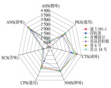 2.2電子舌味覺屬性分析菜用大豆酸味、苦味、甜味、鮮味及咸味5種味覺屬性值見圖2。在5個(gè)味覺屬性中,菜用大豆鮮甜咸味較為突出。從鮮味值來(lái)看,蘇豆18號(hào)的鮮味的響應(yīng)值為2947.47,高于其他5個(gè)品種的響應(yīng)值。在甜味的響應(yīng)值上,響應(yīng)值范圍在2975.50~3472.11,各樣品甜味響應(yīng)值從大到小依次為通7-391-1為3472.11、蘇豆18號(hào)為3427.22、邳縣四粒糙為3352.83、青6號(hào)為3344.78、青棵圓豆為3297.19、四粒黃為2975.50,與感官評(píng)價(jià)各樣品鮮甜味數(shù)值大小排序一致。從味覺響應(yīng)值數(shù)據(jù)中我們還可以看出,電子舌分析的結(jié)果和感官評(píng)價(jià)評(píng)分的結(jié)果具有一定相關(guān)性。