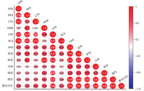 2.3電子舌和感官評(píng)價(jià)相關(guān)性分析利用皮爾遜系數(shù)對(duì)菜用大豆電子舌評(píng)價(jià)值和人工感官評(píng)價(jià)得分進(jìn)行相關(guān)性分析,結(jié)果如圖3所示。從圖中可以看出,電子舌酸味與咸味和苦味呈極顯著正相關(guān),相關(guān)系數(shù)分別為0.919、0.996。咸味與苦味呈極顯著正相關(guān),r>0.930。同時(shí),在感官評(píng)價(jià)中,發(fā)現(xiàn)對(duì)菜用大豆的整體評(píng)價(jià)與其甜味、鮮味、風(fēng)味、硬度和糯性均呈現(xiàn)高度相關(guān)性。說明整體食用品質(zhì)較好的菜用大豆,必然呈現(xiàn)鮮甜軟糯,具有大豆固有的清甜香味。值得注意的是,電子舌鮮甜味與人工感官評(píng)價(jià)的鮮甜味關(guān)聯(lián)度較高,電子舌鮮甜味與感官評(píng)價(jià)鮮甜味呈極顯著正相關(guān),鮮味相關(guān)系數(shù)達(dá)0.926,甜味的相關(guān)系數(shù)達(dá)到0.983。說明電子舌與感官評(píng)價(jià)對(duì)菜用大豆的滋味品評(píng)具有一致性,尤其體現(xiàn)在菜用大豆的甜味和鮮味2個(gè)味覺屬性。