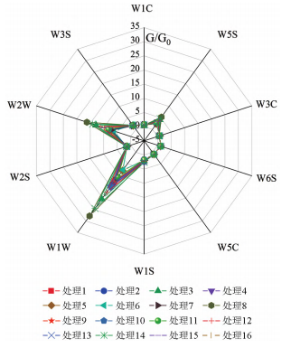 圖1是基于電子鼻技術(shù)對山櫻花16個處理的櫻花香氣組成成分響應(yīng)值構(gòu)建的雷達(dá)圖。從圖1可以看出,10個傳感器對櫻花香氣組分的響應(yīng)存在顯著差異(P<0.01),響應(yīng)值‘G/G0值’分布于0.9~29之間。W1C、W5S、W1S、W1W、W2W和W3S傳感器對櫻花香氣組分響應(yīng)值較大,響應(yīng)值從高到低依次為W1W、W2W、W5S、W1S、W3S、W1C,其余傳感器對櫻花香氣組分響應(yīng)值較?。℅/G0值≈1)。因此,優(yōu)選出W1C、W5S、W1S、W1W、W2W和W3S傳感器進(jìn)行數(shù)據(jù)提取與分析。