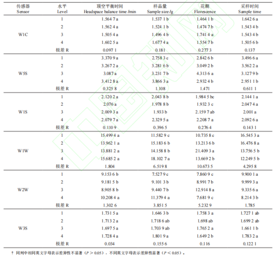 不同因素對電子鼻響應(yīng)特性的影響不同因素對電子鼻各傳感器(W1C、W5S、W1S、W1W、W2W和W3S傳感器)的影響見表1。從表3可知,不同因素對電子鼻測定櫻花花香的影響差異顯著,對電子鼻傳感器的響應(yīng)影響從大到小依次是不同花期、樣量、采樣時間,在不同頂空平衡時間因素下電子鼻各傳感器響應(yīng)極差均最小。從各因素的不同水平看,在不同頂空平衡時間因素中,水平1、4高于水平2、3;樣品量中水平4的電子鼻各傳感器響應(yīng)值顯著高于其他水平,水平1、2、3差異不顯著;在不同花期因素下,除了W1S傳感器之外,其余傳感器在水平3時的響應(yīng)值高于其他水平,且與其他水平差異極顯著;采樣時間中各水平差異不顯著。說明電子鼻對盛開時期的櫻花花朵且樣品量為4g時響應(yīng)較大。
