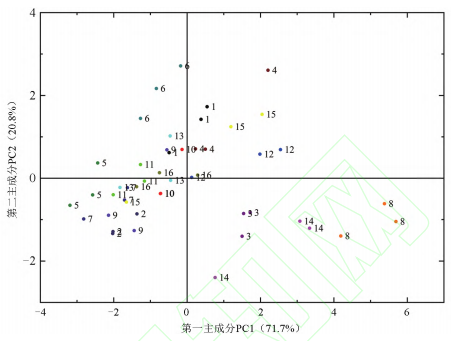 圖2是基于山櫻花香氣的電子鼻數(shù)據(jù)(W1C、W5S、W1S、W1W、W2W和W3S傳感器響應(yīng)值G/G0)構(gòu)建的主成分分析圖(PCA)。第一主成分PC1的貢獻(xiàn)率為71.7%,第二主成分PC2的貢獻(xiàn)率為20.8%,總貢獻(xiàn)率達(dá)到92.5%,說明第一、第二主成分能很好地反映供試樣品的整體信息。從圖2可以看出,3、6、8和14號處理組合與其他處理組合的樣本點沒有重疊,由此可以區(qū)分出3、6、8和14號處理。結(jié)合圖1可知8號處理各傳感器的響應(yīng)值顯著高于其他處理,且與其他處理差異極顯著。因此,8號處理,即A2B4C3D2處理組合(在12:00采集盛開時期的櫻花花朵4g,在頂空平衡30min后進(jìn)行電子鼻測定)的表現(xiàn)最優(yōu),為電子鼻快速測定櫻花香氣的最優(yōu)組合。