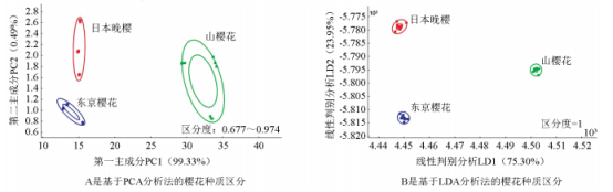 采用PCA和LDA法對3種櫻花進(jìn)行分析(圖3),從圖3可以看出,不同種櫻花的樣本點沒有重疊,每種櫻花樣本點均有特定的分布區(qū)域。PCA結(jié)果顯示第一主成分PC1的貢獻(xiàn)率為99.33%,第二主成分PC2的貢獻(xiàn)率為0.49%,這兩個主要成分解釋了總方差的99.82%(圖3A),不同種質(zhì)區(qū)分度達(dá)到0.677~0.974。從LDA分析結(jié)果可以看出(圖3B),判別式LD1和判別式LD2的貢獻(xiàn)率分別為75.30%和23.95%,總貢獻(xiàn)率達(dá)到99.25%,稍低于PCA的總貢獻(xiàn)率(99.82%),但不同種質(zhì)區(qū)分度為1高于PCA分析的區(qū)分度,并且從LDA分析圖中發(fā)現(xiàn),每種櫻花樣本點相比于PCA樣本點更為集中。
