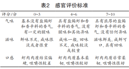 感官評(píng)價(jià)小組(8人)從鹽焗蝦的口感、滋味和氣味3個(gè)方面評(píng)定其品質(zhì),每項(xiàng)滿分為10分,感官評(píng)價(jià)總分為30分,評(píng)分標(biāo)準(zhǔn)見(jiàn)表1。