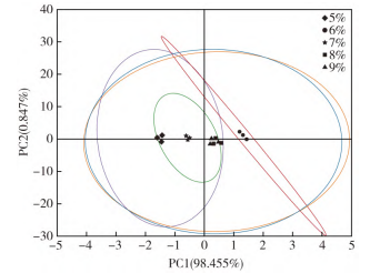 圖2顯示了每個植物蛋白肉樣品的味道接近程度,在主成分分析圖上,樣品之間距離越大,表明樣品之間的整體滋味差異越大;樣品之間距離越小,表明樣品之間的滋味越相似。第一主成分(PC1)與第二主成分(PC2)的貢獻率分別為98.455%和0.847%,兩者貢獻率之和達到了99.302%,樣品在電子舌主成分分析圖上的區(qū)分指數(shù)達到96,表明PC1和PC2包含了原始數(shù)據(jù)的大多數(shù)信息,能夠反映樣品的整體信息。不同樣品間較明顯地分為了4個區(qū)域,9%和8%之間的距離相對較小。PCA結(jié)果說明基于電子舌滋味檢驗?zāi)苡行^(qū)分5個樣品。