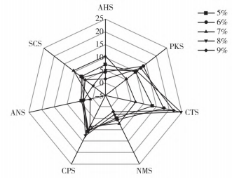 不同樣品酸味、甜味、苦味、咸味、鮮味5個滋味的排序見圖3,電子舌傳感器相對強度值存在明顯差異,表明電子舌測試可有效地區(qū)分不同樣品的滋味。5個樣品在ANS傳感器上的響應(yīng)強度無明顯差異,在SCS、PKS、NMS、CTS、CPS、AHS傳感器上的響應(yīng)強度存在差異,不同樣品的酸味、咸味、鮮味相對強度值從小到大的順序為酸味排序:6%<8%<9%<7%<5%,咸味排序:6%<9%<8%<7%<5%,鮮味排序:6%<8%<9%<7%<5%。