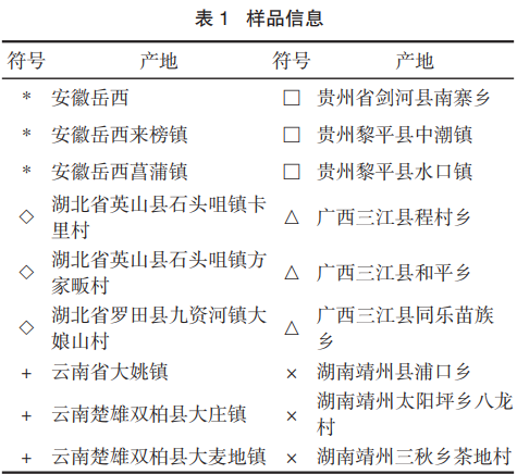 藥材樣品采集于安徽、云南、貴州、廣西、湖北、湖南等6個(gè)?。▍^(qū))18個(gè)產(chǎn)地。