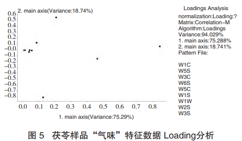 Loadings分析的算法與PCA的算法相同,是對(duì)傳感器的分析,得出傳感器區(qū)分樣品的能力。由圖分析可推測(cè),各產(chǎn)地的茯苓樣品在氣味上的差異主要來(lái)自于無(wú)機(jī)硫化物、有機(jī)硫化物、甲基類化合物和氮氧化合物。