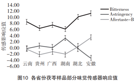 茯苓味覺(jué)信息的雷達(dá)圖分析可知,茯苓甜味顯著,但各產(chǎn)地之間差異不顯著。各產(chǎn)地的茯苓樣品味覺(jué)值的差異主要集中在苦味、澀味和苦味的回味上。因此,選擇苦味、澀味、苦味的回味進(jìn)行分析探討產(chǎn)地之間的差異,結(jié)果如圖10所示。由圖可知,湖北和安徽的茯苓樣品苦味和苦味的回味都顯著高于長(zhǎng)江以南——云南、貴州、廣西、湖南的茯苓樣品,且湖北和安徽的茯苓樣品苦味的回味在無(wú)味點(diǎn)0以上,長(zhǎng)江以南的樣品苦味的回味都在無(wú)味點(diǎn)以下。對(duì)于澀味,長(zhǎng)江以北的茯苓澀味在無(wú)味點(diǎn)以下,而長(zhǎng)江以南的茯苓澀味都在人的無(wú)味點(diǎn)以上。