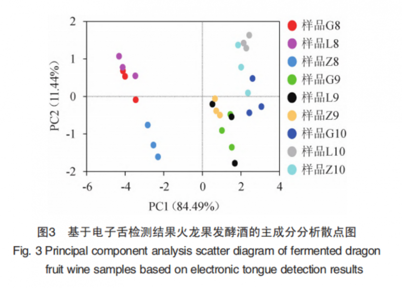 為了進(jìn)一步探明產(chǎn)地和采收時(shí)間對(duì)紅肉火龍果發(fā)酵酒品質(zhì)的影響,本實(shí)驗(yàn)室前期利用貴州省3個(gè)產(chǎn)地(關(guān)嶺、羅甸和貞豐)和3個(gè)采收時(shí)間(8月、9月、10月)的紅肉火龍果 釀造了發(fā)酵酒,并對(duì)其火龍果酒的基本質(zhì)量進(jìn)行了評(píng)價(jià)。本研究在此基礎(chǔ)上利用智能感官技術(shù)(電子鼻和電子舌)對(duì)不同采收時(shí)間(8月、9月、10月)及貴州產(chǎn)地(關(guān)嶺、羅甸、貞豐)火龍果的發(fā)酵酒氣味及滋味特征進(jìn)行研究,對(duì)其進(jìn) 行主成分分析,并采用頂空固相微萃取-氣相色譜質(zhì)譜聯(lián)用儀對(duì)其揮發(fā)性風(fēng)味成分進(jìn)行分析,以期揭示不同產(chǎn)地和采收季節(jié)火龍果釀造發(fā)酵酒的風(fēng)味差 異規(guī)律,為貴州省火龍果發(fā)酵酒的品質(zhì)控制提供參考。