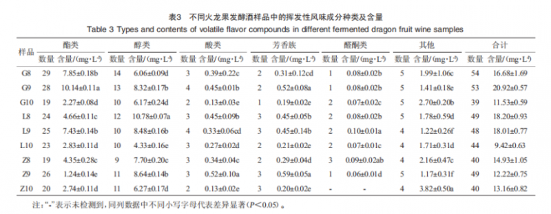 03不同產(chǎn)地和采收時(shí)間火龍果發(fā)酵酒的揮發(fā)性風(fēng)味成分分析