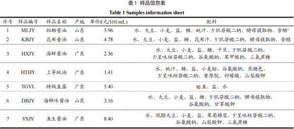 用于分析測試的海鮮調(diào)味汁分別為不同產(chǎn)地的典型代表性產(chǎn)品,分別為牡蠣醬油、昆布醬油、海鮮醬油、上等蠔油、特級魚醬油、釀造醬油、魚生醬油(上述樣品均為n=3),分別購自廣東廣州的超級市場和京東商城。樣品信息見表1。