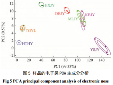 結(jié)合 PCA 貢獻(xiàn)率分析(根據(jù)電子鼻軟件內(nèi)部的計(jì)算方式得到,數(shù)值越接近于1說明樣品的區(qū)分越顯著),由圖可見,HTHY 和 TGYL 兩個樣品與其余5個樣品之間的氣味差異明顯。5個JY樣品之間也存在明顯的氣味差異,其中KBJY和MLJY二者在氣味上非常接近;其余三者在圖中的落點(diǎn)也沒有重疊或者堆積在一處,可見氣味并不相似。