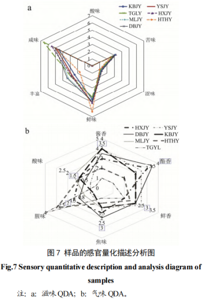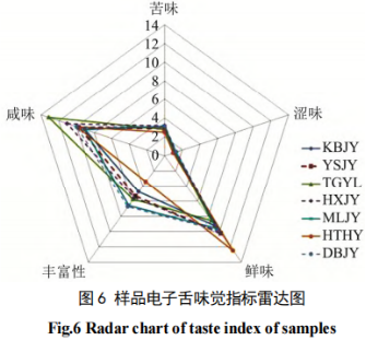 采用電子鼻和電子舌技術(shù)對海鮮調(diào)味汁的風(fēng)味進(jìn)行了分析和比較,結(jié)果表明,HTHY 和TGYL與其他樣品的風(fēng)味差異明顯,KBJY和MLJY在氣味上最為接近。電子舌分析結(jié)果和感官結(jié)果有高度的一致性。蠔油含有最多的鮮味氨基酸和鮮味評分,魚露呈現(xiàn)最強(qiáng)的咸味,牡蠣醬油和海鮮味醬油的滋味豐富性比較好,蠔油的滋味后味最差。智能感官分析技術(shù)對海鮮調(diào)味汁這類咸鮮調(diào)味料的應(yīng)用前景廣闊。