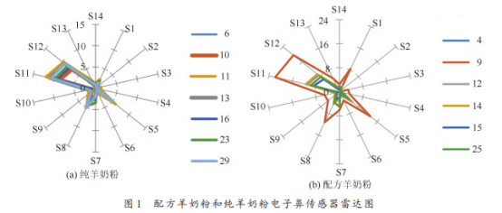 配方羊奶粉和純羊奶粉的雷達(dá)圖如圖1所示。兩類奶粉在S5、S8、S11、S12等傳感器中均表現(xiàn)出更高的響應(yīng)值,說明羊奶粉中揮發(fā)性物質(zhì)主要對(duì)應(yīng)于這幾個(gè)傳感器的物質(zhì),推測(cè)可能主要是醛酮類、酸類、烷烴類、醇類。除此之外,與純奶粉相比,部分配方羊奶粉在S1、S7、S9、S10還有較突出的響應(yīng)峰出現(xiàn),推測(cè)可能主要是胺類、氨類及烷烴物質(zhì)。