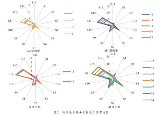 通過電子鼻雷達(dá)圖推測(cè)羊奶粉中揮發(fā)性物質(zhì)主要為醛酮類、酸類、烷烴類、醇類,部分配方羊奶粉還有胺類、氨類及烷烴類物質(zhì)。此外,陜西地區(qū)各市之間的純羊奶粉性質(zhì)相似。通過電子鼻雷達(dá)圖可以準(zhǔn)確快速地反映不同羊奶粉樣品的整體風(fēng)味
