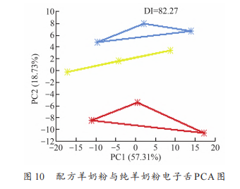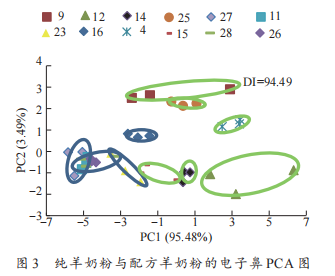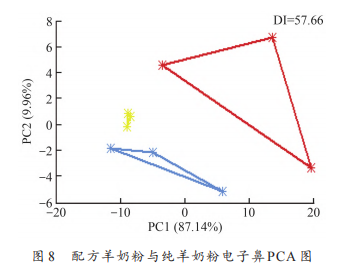 電子鼻測(cè)定純羊奶粉及配方羊奶粉的PCA結(jié)果見圖8。PCA結(jié)果將奶粉歸為3個(gè)區(qū)域,分別為紅色區(qū)域,黃色區(qū)域以及藍(lán)色區(qū)域,溯源到奶粉種類發(fā)現(xiàn)紅色區(qū)域?yàn)榕浞窖蚰谭?,黃色區(qū)域?yàn)榕浞窖蚰谭叟c純羊奶粉等比例混合,藍(lán)色區(qū)域?yàn)榧冄蚰谭邸<冄蚰谭?、配方羊奶粉以及混合奶粉距離較遠(yuǎn),區(qū)分度較好。綜上,電子鼻可實(shí)現(xiàn)對(duì)純羊奶粉及配方羊奶粉的區(qū)分。