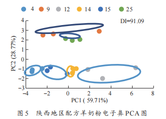 電子鼻測(cè)定陜西地區(qū)配方羊奶粉的PCA結(jié)果見圖5。根據(jù)PC2可以將陜西地區(qū)配方羊奶粉歸結(jié)為2個(gè)區(qū)域,溯源到奶粉品牌發(fā)現(xiàn),羊奶粉9、25均為嬰幼兒配方羊奶粉,羊奶粉4、14、15分別為中老年配方羊奶粉、幼兒配方羊奶粉和學(xué)生奶粉,羊奶粉12為中老年無蔗糖配方羊奶粉。結(jié)果表明電子鼻對(duì)嬰兒配方奶粉區(qū)分性更好。