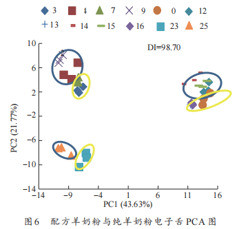 純羊奶粉與配方羊奶粉的電子舌測(cè)定結(jié)果見圖10。根據(jù)PCA結(jié)果將奶粉歸為3個(gè)區(qū)域,分別為紅色區(qū)域,黃色區(qū)域以及藍(lán)色區(qū)域,溯源到奶粉種類發(fā)現(xiàn)紅色區(qū)域?yàn)榕浞窖蚰谭?,黃色區(qū)域?yàn)榕浞窖蚰谭叟c純羊奶粉等比例混合,藍(lán)色區(qū)域?yàn)榧冄蚰谭邸<冄蚰谭?、配方羊奶粉以及混合奶粉距離較遠(yuǎn),區(qū)分度較好。綜上,電子舌可實(shí)現(xiàn)對(duì)純羊奶粉及配方羊奶粉的區(qū)分。