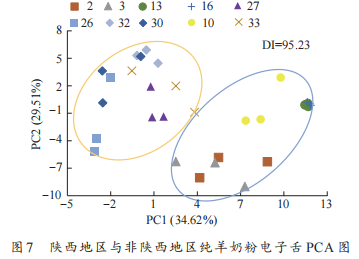 對(duì)29種羊奶粉按陜西地區(qū)與非陜西地區(qū)分別選擇5種進(jìn)行區(qū)分,陜西地區(qū)與非陜西地區(qū)純羊奶粉的電子舌PCA結(jié)果見圖7。根據(jù)PC1和PC2可以將羊奶粉歸為2個(gè)區(qū)域,陜西地區(qū)和非陜西地區(qū)純羊奶粉距離均較遠(yuǎn)且各地區(qū)分布較集中,表明兩地區(qū)之間的差異性可得到較好區(qū)分,因此基于電子舌技術(shù)可實(shí)現(xiàn)對(duì)陜西地區(qū)及非陜西地區(qū)純羊奶粉的區(qū)分。