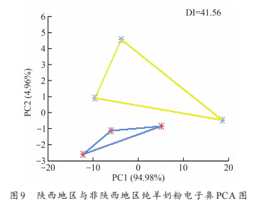 電子鼻測(cè)定陜西地區(qū)及非陜西地區(qū)純羊奶粉的PCA結(jié)果見圖9。根據(jù)PCA結(jié)果可以看出,陜西地區(qū)(黃色區(qū)域)與非陜西地區(qū)(藍(lán)色區(qū)域)純羊奶粉數(shù)據(jù)點(diǎn)相距較遠(yuǎn),得到了較好區(qū)分。