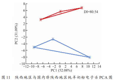 陜西地區(qū)與國內(nèi)非陜西地區(qū)純羊奶粉的電子舌PCA結(jié)果見圖11。紅色區(qū)域(陜西地區(qū))和藍(lán)色區(qū)域(國內(nèi)非陜西地區(qū))純羊奶粉距離均較遠(yuǎn),表明兩地域之間差異性可得到較好區(qū)分,因此基于電子舌技術(shù)可實(shí)現(xiàn)對(duì)陜西地區(qū)及非陜西地區(qū)純羊奶粉的區(qū)分。