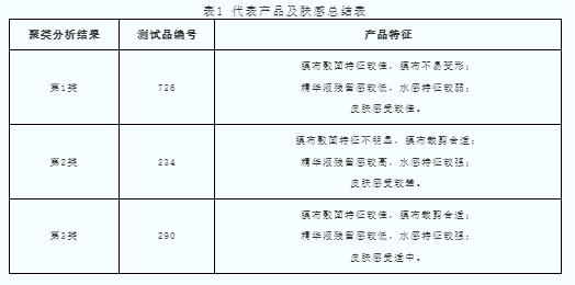 (1)通過感官Q(mào)DA測試,結合主成分分析與聚類分析,定位該類面膜的主要感官屬性,總結3類面膜的膚感特征,選出每一類的代表品;