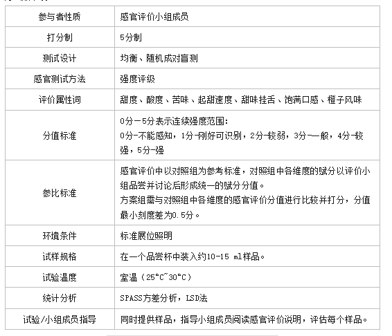 最終經(jīng)由感官評(píng)價(jià)小組測評(píng),伊比西方案在飽滿口感方面有明顯提升,在橙子風(fēng)味方面有顯著激發(fā)效果,并加速起甜,縮短了甜味掛舌時(shí)間,整體實(shí)現(xiàn)了水果風(fēng)味清晰易識(shí)別、甜感純正似蔗糖、整體風(fēng)味干凈無異味的整體改善。