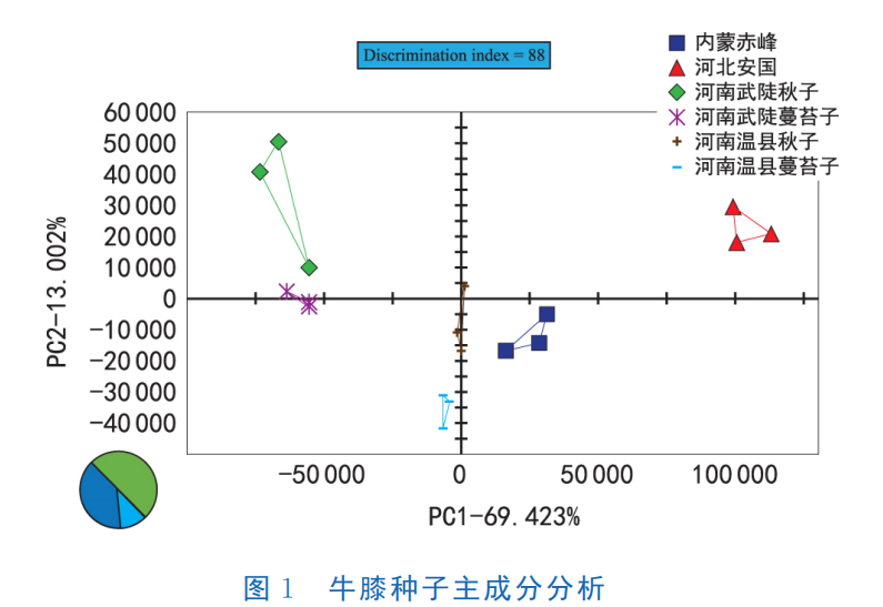 圖1為不同產(chǎn)地、不同類型牛膝種子的主成分分析圖。由圖1可知,PCA區(qū)分指數(shù) 為 88,區(qū)分指數(shù)框為綠色,表明區(qū)分有效。第一PCA(PC1)的累積貢獻率為69.423%,第一PCA(PC1)和第二PCA(PC2)的累積貢獻率之和為82.425%,表明牛膝不同炮制品氣味的差異主要由PC1決定。