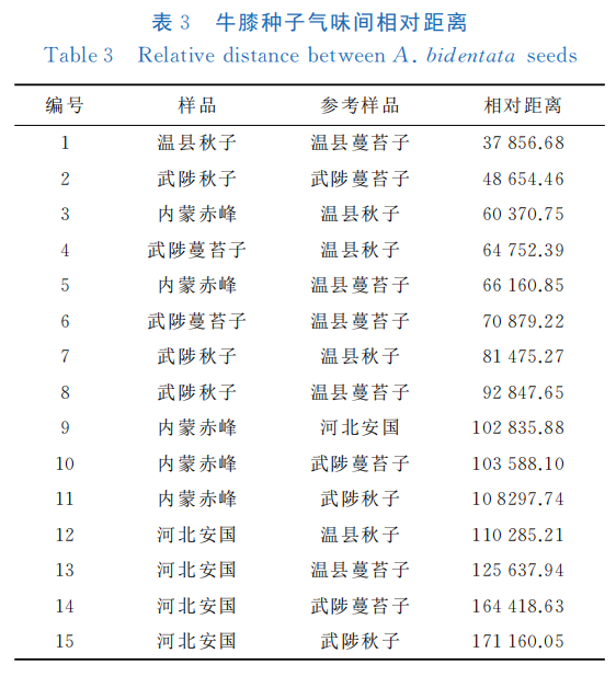 表3為樣品氣味兩兩間相對距離表。樣品間的相對距離越近,則整體氣味越接近,反之亦然。由表3可知,溫縣秋子與溫 縣蔓苔子的相對距離最近(37859.68),其次是武陟秋子與武陟蔓苔子(48654.46),秋子與蔓苔子是牛膝的2種不同繁殖類型的種子,其整體氣味較相近,符合實際生產(chǎn)規(guī)律。而河北安國與武陟秋子相對距離最遠(171160.05),即其氣味與武陟秋子差異最大。