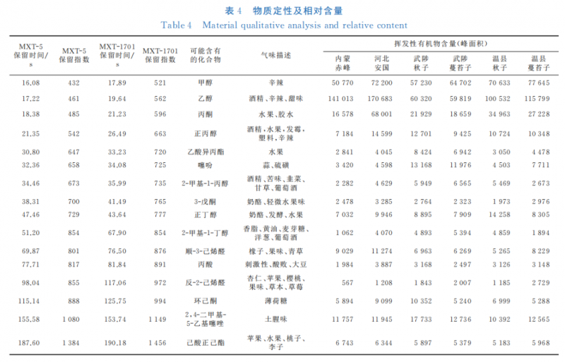 用AroChembase數(shù)據(jù)庫對樣品中的揮發(fā)性化合物進行定性分析,其可能含有的化合物如 表 4所 示。由表4可知,不同牛膝種子樣品的揮發(fā)性氣味化合物在含量上存在差異。牛膝種子中揮發(fā)性化合 物etha-nol平均含量最高,峰面積范圍為59819~170;揮發(fā)性化合物(E)-2-hexenal平均含量最低,峰面積范圍為567~1185。武陟秋子和蔓苔子的揮發(fā)性氣味化合物在含量上較為接近,溫縣秋子和蔓苔子的揮發(fā)性氣味化合物在含量上也較為接近,說明秋子與蔓苔子的揮發(fā)性氣味化合物較為相似。不同來源牛膝種子的氣味化合物含量差異較大,證明Heracles Ⅱ超快速氣相電子鼻能夠快速準確地識別出不同來源牛膝種子之間的差異,牛膝種子檢測提供了新技術。