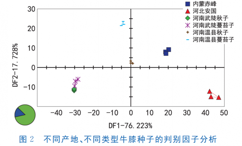對不同產(chǎn)地、不同類型的牛膝種子進行判別因子分析,結果如圖2所示,6種樣品均能被較好地區(qū)分。武陟秋子與武陟蔓苔子較相近,二者區(qū)分效果較差。