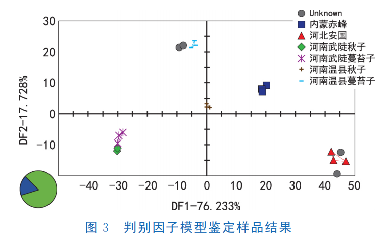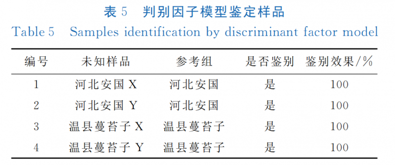 未知樣品分別為屬于河北安國樣品組的河北安國X、河北安國Y及屬于河南溫縣蔓苔子樣品組的河南溫縣蔓苔子X、河南溫縣蔓苔子Y。由此可知判別因子模型為有效模型,可用于不同產(chǎn)地牛膝種子的區(qū)分,使PCA結果得到進一步驗證。