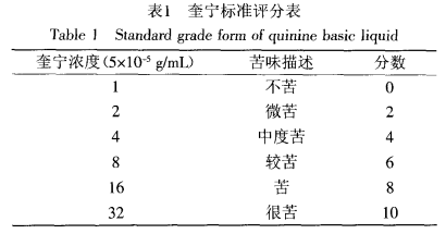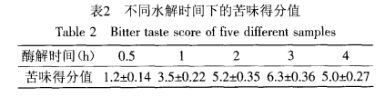 本文首先對大豆肽的苦味特性進(jìn)行人工感官評價(jià),然后冉研究電子舌儀器進(jìn)行感官分析。本實(shí)驗(yàn)從對苦味敏感的專業(yè)人員中選取10位感官評價(jià)員(5男5女)進(jìn)行感官評價(jià),每次品嘗之后,需要用清水漱口,再進(jìn)行下一次品嘗。最后,將與其口味接近的奎寧標(biāo)準(zhǔn)液濃度對應(yīng)的分值記為此溶液的得分。之后取10位評價(jià)人員的平均分為苦味評定分?jǐn)?shù)。以奎寧的作為評分標(biāo)準(zhǔn),評分標(biāo)準(zhǔn)見表1。表2為風(fēng)味蛋白酶不同水解時(shí)問下的苦味得分值。