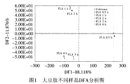 采用法國AlphaMOS電子舌對制取的五種不同酶解時(shí)間條件下的樣品進(jìn)行苦味特性研究。分別采用DFA模式識(shí)別方法和PLS預(yù)測模型對采集的數(shù)據(jù)進(jìn)行定性和定量分析,研究表明:采用DFA分析法能夠?qū)ξ宸N不同的大豆肽樣品的呈味特性和味覺相似程度進(jìn)行定性評價(jià),PLS模型能對未知樣品進(jìn)行呈味預(yù)測;大豆肽的苦味預(yù)測結(jié)果與實(shí)際感官評價(jià)吻合。研究結(jié)果為后續(xù)大豆肽產(chǎn)品的呈味特性研究提供一種新的方法途徑。