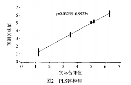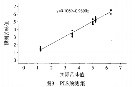 用PLS建立大豆肽溶液電子舌苦味預(yù)測模型,并對電子舌傳感器響應(yīng)值與人工感官評價(jià)得分值問的相關(guān)性進(jìn)行研究。以七根傳感器的響應(yīng)信號(hào)值為白變量,以感官得分值為因變量構(gòu)建偏最小二乘模型。建模集為60個(gè)樣本,驗(yàn)證集為30個(gè)樣本。結(jié)果如圖2、圖3所示,分別表示建模集、預(yù)測集的實(shí)際苦味值與預(yù)測值的相關(guān)圖。