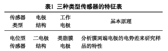 電子舌技術(shù)已經(jīng)被應(yīng)用到各個(gè)領(lǐng)域,同時(shí)在對(duì)不同領(lǐng)域的不同樣品進(jìn)行檢測(cè)時(shí),對(duì)味覺傳感器陣列的要求會(huì)有所不同。目前在應(yīng)用的傳感器種類很多,根據(jù)其工作原理不同可分為電位型、伏安型、阻抗譜型、光尋址型、物理型以及生物傳感器等種類。我們查閱資料發(fā)現(xiàn)在食品研究中應(yīng)用最多的傳感器陣列主要是電位型、伏安型與阻抗譜型,三種類型傳感器的特征見表1。