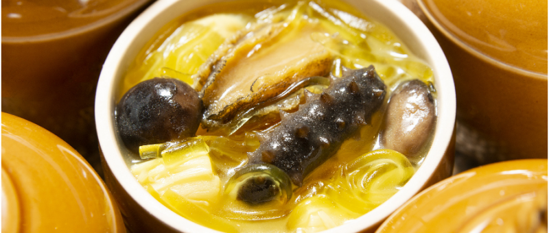 “佛跳墻”是傳統(tǒng)閩式菜肴的特色名菜之首,通常以鮑魚(yú)、海參、甲魚(yú)裙、魚(yú)膠、杏鮑菇、蹄筋、花菇、瑤柱和鴿子蛋等為原料,加入熬制好的高湯后文火煨制而成。“佛跳墻”因營(yíng)養(yǎng)價(jià)值豐富、風(fēng)味鮮美濃郁而廣受人們青睞。