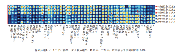 兩種“佛跳墻”樣品的特征揮發(fā)性組分具有各不相同的GC-IMS特征譜信息。傳統(tǒng)熬制工藝下佛跳墻部分揮發(fā)性有機(jī)物濃度高于現(xiàn)代熬制工藝。揮發(fā)性組分定性分析