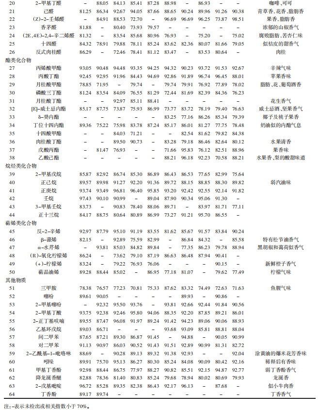 10種辣木籽的氣味成分、相關(guān)指數(shù)及感官描述見(jiàn)表2。由表2可知,10種辣木籽共檢出64種氣味物質(zhì)成分,其中醇類化合物8種,酮類化合物9種,醛類化合物9種,酯類化合物12種,烷烴類化合物6種,萜烯類化合物6種,其他類化合物14種。